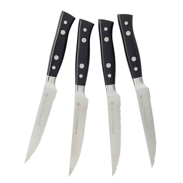 The PADERNO Montgomery Fully Forged 4-Piece Steak Knife Set is thoughtfully designed for optimal durability, professional use and classic style. Each knife is fully forged from a single piece of German stainless steel from blade tip to handle base for superior durability and stability, while the tempered and hardened blade sharpens easily and stays sharper longer. Proudly certified by NSF International for use in commercial kitchens, the ergonomically contoured bolster encourages a professional and comfortable grip.